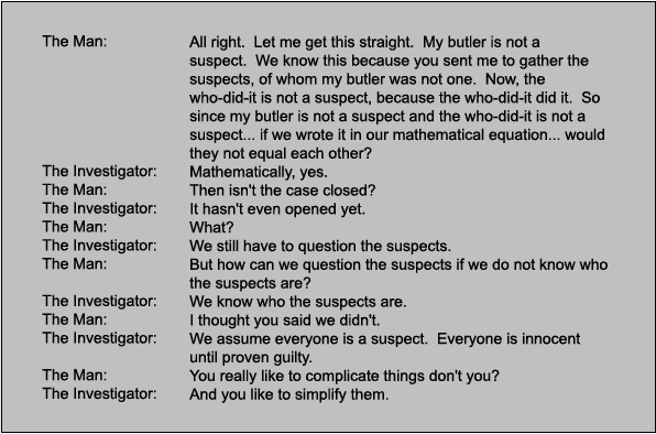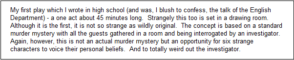 My first play which I wrote in high school (and was, I blush to confess, the talk of the English Department) - a one act about 45 minutes long. Strangely this too is set in a drawing room. Although it is the first, it is not so strange as wildly original. The concept is based on a standard murder mystery with all the guests gathered in a room and being interrogated by an investigator. Again, however, this is not an actual murder mystery but an opportunity for six strange characters to voice their personal beliefs. And to totally weird out the investigator.