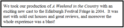 We took our production of A Weekend in the Country with an exciting new cast to the Edinburgh Festival Fringe in 2004. It was met with sold out houses and great reviews, and moreover the whole experience was a blast!