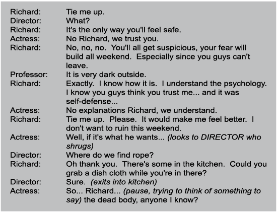 This play is a one-act, about an hour in legnth (an hour fifteen, depending), and my favourite. It centres around the events of a weekend in the country home of Richard. He invites six of his friends for a relaxing time only to have them discover a dead body under the couch. Explaining this play is rather difficult. It is not s murder mystery, nor is it A Weekend at Bernie's sort of romp with a dead body (although such romps I agree are very enjoyable). The body is disposed of easily, and it is established that Richard did indeed do it , but with very good reason, all within the first ten minutes of the play. What follows is more of an examination of artists and their egos. And we watch as each character blindly influences the others to hilarious and disturbing results. Claiming a play is a dark comedy is a bad idea as in this day and age there seem to be few other kinds. Nonetheless, I have no simpler way of describing this play. I have only left to add that there is, for your entertainment, much blood, a bit of music, and, of course, turkey.